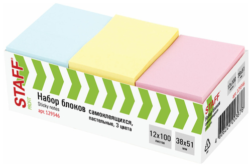 38x51 мм, 100л в блоке, пастель 3 цвета, 12 бл