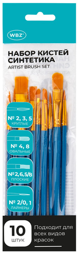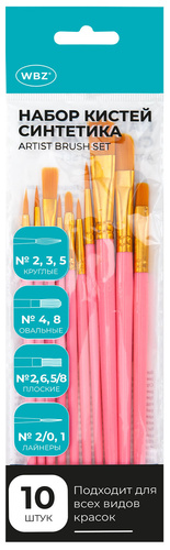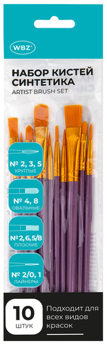 Кисти набор 10 штук синтетика № 2/0-8 (Круглые; Овальные; Плоские; Лайнеры)
