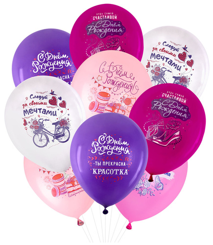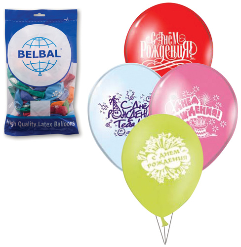 12" (30 см), комплект 5 штук, ассорти 5 цветов, с рисунком "С Днем Рождения", пакет