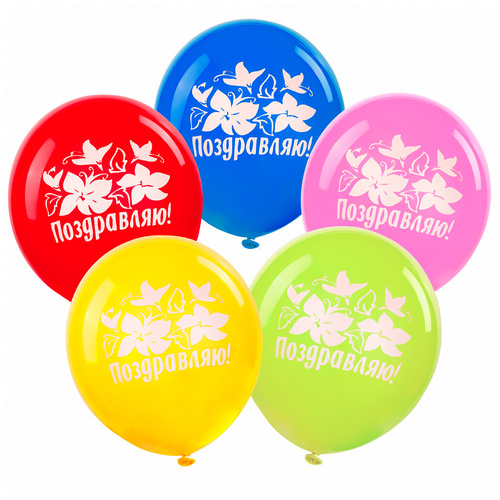 12" (30 см), комплект 5 штук, ассорти 5 цветов, с рисунком "Поздравляю", пакет