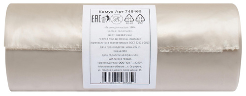 160 л, 90х110 см, 60 мкм, прозрачные, 10 шт/рул
