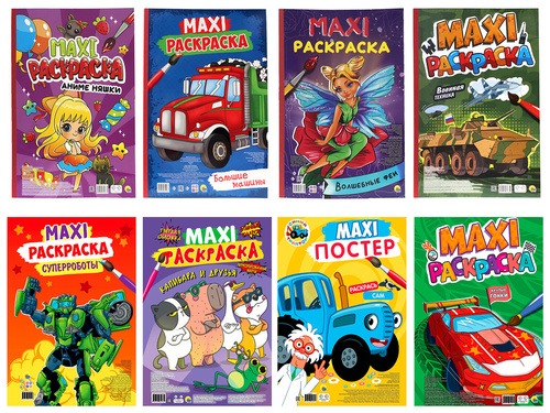 "МАКСИ-РАСКРАСКА", ассорти, 340х485 мм, 20 стр., внутренний блок 100 г/м2, 8 шт/уп