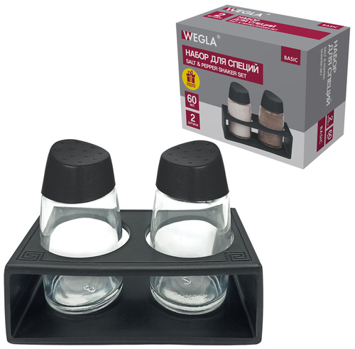 2х60 мл, BASIC, подставка + солонка + перечница, стекло/пластик, черный