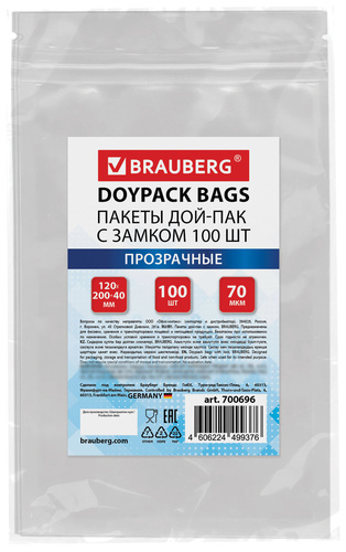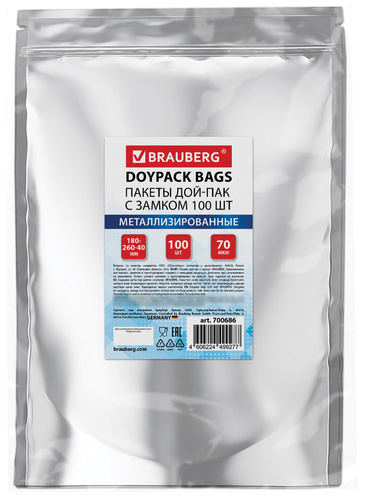 Пакеты фасовочные дой-пак с замком ZIP LOCK, металлизированная + прозрачная стенка BRAUBERG