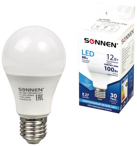 12Вт, 220-240В, 4000K, цоколь Е27, груша, нейтральный белый свет
