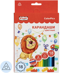 Карандаши цветные Комус Класс ColorPics 18 карандашей 18 цветов трёхгранные<br> <br> Набор цветных карандашей предназначен для рисования, раскрасок и скетчей (быстрых зарисовок). Карандаши изготовлены из природного сырья и качественной, химически необработанной древесины мелколистной липы, выращенной в экологически чистых районах Поволжья. Продукт нетоксичен и безопасен для использования детьми. Стержни вклеиваются по специальной технологии с использованием укрепляющих материалов, что повышает прочность и надёжно удерживает стержень внутри корпуса. Такая конструкция защищает стержень от повреждений при падении, ударе или воздействии влаги, при этом не изменяются цвет, твёрдость и свойства при заточке. <br> <br> Карандаши оснащены супермягкими стержнями, обеспечивающими яркий и насыщенный цвет при любом нажиме. Цветовая палитра в наборе составлена с учётом цветового круга, что делает её универсальной для творческих задач. Форма корпуса трёхгранная, она позволит малышу легко научиться правильно располагать пальцы, держать карандаш «щепоткой», а не в кулаке. Диаметр — 7 мм, длина карандаша — 175 мм, диаметр стержня — 2,9 мм. Дополнительные элементы в комплект не входят. <br> <br> Поставляется в цветной картонной упаковке с европодвесом, размер 215×135×8 мм. Товар сертифицирован для детей от 3 лет и безопасен для использования.