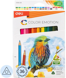 Карандаши цветные Deli Color Emotion 36 карандашей 36 цветов трёхгранные (EC00230)<br> <br> Цветные карандаши Deli Color Emotion подходят для скетчей и иллюстраций. Трёхгранная форма корпуса обеспечивает комфорт при использовании. Цвет стержня совпадает с цветом корпуса. Это удобно для выбора оттенка. Грифель тонкий, мягкий, прочный и не крошится. Хорошо затачивается. Карандаши смешиваются, имеют 100% интенсивность окрашивания. Пигмент профессионального качества. Устойчивы к свету.<br> <br> Удобная коробка с европодвесом подходит для школы и путешествий. Карандаши изготавливаются из липы. В наборе 36 шт. Количество цветов — 36. Тип упаковки — картонная коробка с европодвесом. Материал корпуса — дерево. Длина корпуса — 175 мм. Диаметр грифеля — 3 мм. Страна происхождения — Китай. Форма корпуса — трёхгранная. Диаметр корпуса — 8 мм. Размер упаковки — 143×18×185 мм. <br> <br> Продукт применяется в искусстве и дизайне.