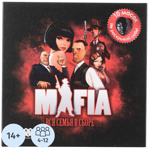 Настольная игра Hobby World Мафия Вся семья в сборе<br><br>«Мафия. Вся семья в сборе» — это классическая психологическая игра, в которой мирные жители пытаются вычислить преступников, а мафиози — захватить власть в городе. Каждую ночь мафия устраняет одного из мирных, а днём город обсуждает подозреваемых, стремясь разоблачить преступников. Умение блефовать, анализировать и убеждать — ключ к победе!<br><br>Игроки берут на себя роли мирных жителей, гангстеров, полиции и других персонажей, каждый из которых влияет на ход игры. Атмосферу дополнительно создают пластиковые маски, которые делают процесс ещё более захватывающим.<br><br>Игра рассчитана на 4-12 игроков и подойдёт для детей от 14 лет и взрослых. Один игрок обязательно должен быть ведущим, а это значит, что принять на себя роль мафии или мирных жителей смогут от 4 до 12 человек. Средняя продолжительность партии составляет 30-60 минут. Размер упаковки — 296×296×140 мм.<br><br>Состав набора:<br>— 10 пластиковых масок;<br>— 30 карт ролей:<br>— 6 лидеров мирных жителей;<br>— 5 особых мирных жителей;<br>— 5 обычных мирных жителей;<br>— 3 одиночки;<br>— 4 особых мафиози;<br>— 4 обычных мафиози;<br>— 3 якудзы;<br>— 21 карточка для ведущего;<br>— Правила игры.