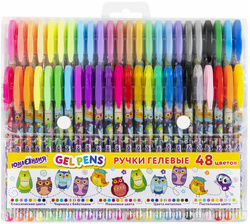 Ручка имеет круглый яркий корпус с печатью. Сменный стержень длиной 130 мм со стандартным наконечником позволит использовать ручку максимально долго. Диаметр пишущего узла, равный 1,0 мм, создает линию письма, равную 0,5 мм. Набор включает 48 гелевых ручек: 8 ручек с классическими чернилами, 10 с блестками, 10 с эффектом металлик, 10 пастельных и 10 неоновых. Цвет классических чернил: чёрный, синий, красный, зеленый, розовый, жёлтый, оранжевый, голубой. Цвет чернил с блестками: красный, зеленый, голубой, фиолетовый, золотой, серебряный, розовый, чёрный, синий, жёлтый. Цвет чернил с эффектом металлик: красный, голубой, фиолетовый, золотой, серебряный, розовый, чёрный, коричневый, синий, зеленый. Цвет пастельных чернил: коралловый, жёлто-зеленый, голубой, фиолетовый, оранжевый, жёлтый, розовый, нежно-розовый, нежно-голубой, салатовый. Цвет неоновых чернил: красный, зелёный, голубой, фиолетовый, оранжевый, жёлтый, розовый, фуксия, светло-фиолетовый, салатовый.