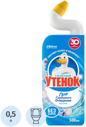 Средство для сантехники чистящее Туалетный утёнок Морской 0,5 л для уборки туалета<br><br><b>Назначение:</b> благодаря уникальной форме горлышка средство легко попадает в труднодоступные места под ободком унитаза, где скапливаются бактерии. Обеспечивает максимальное очищение налёта и ржавчины, устраняет неприятные запахи и придаёт свежий аромат. Сильная формула на основе соляной кислоты уничтожает 99,99% микробов.<br><b>Способ применения:</b> надавив на метки, открутить колпачок. Поднять сиденье унитаза. Нанести средство под ободок по окружности. Для максимального результата после нанесения использовать ёршик для очистки поверхностей над и под водой. Для удаления загрязнений в нижней части унитаза налить средство в воду, оставить на 60 минут и смыть. После применения плотно закрутить колпачок. Использовать регулярно для поддержания чистоты и свежести.<br><b>Меры предосторожности:</b> опасно! При попадании на кожу и в глаза вызывает химические ожоги. Может вызывать коррозию металлов. Токсично для водных организмов с долгосрочными последствиями. Использовать только по назначению. Беречь от детей. При необходимости обратиться за медицинской помощью, показав маркировку продукта. Не смешивать с другими чистящими и отбеливающими средствами. Избегать попадания в окружающую среду. Не вдыхать пары. Избегать попадания на кожу, в глаза и на одежду. Использовать резиновые перчатки и средства защиты глаз/лица. После работы тщательно вымыть руки.<br>— При вдыхании: вывести пострадавшего на свежий воздух, обеспечить покой.<br>— При попадании на кожу или волосы: немедленно снять загрязнённую одежду, кожу обильно промыть водой или под душем.<br>— При попадании в глаза: осторожно промывать водой несколько минут, снять контактные линзы (если есть и легко удалить), продолжить промывание.<br>— При проглатывании: прополоскать рот, не вызывать рвоту, немедленно обратиться за медицинской помощью.<br><b>Состав:</b> вода; 5–15% кислота соляная; <5% катионные ПАВ; <5% отдушка (бутилфенилметилпропиональ — потенциальный аллерген); <5% краситель.<br><b>Условия хранения:</b> хранить плотно закрытым, только в упаковке завода-изготовителя, в вертикальном положении, при температуре от —5 до +25°C, в недоступном для детей, посторонних и домашних животных месте, отдельно от пищевых продуктов.<br><b>Срок годности:</b> 24 месяца с даты изготовления (дату изготовления см. на упаковке).<br>