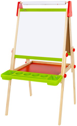 Поверхность мольберта белого цвета предназначена для рисования специальным маркером для белой доски, а также для размещения магнитов; черная поверхность - для рисования мелками. Для детей старше 3-х лет. Регулируется по высоте от 90 до 110 см для удобства использования детьми разного возраста и роста. Размер рабочей поверхности: 43х48 см. Цвет рамки: зеленый.