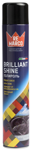 Полироль для пластика Re Marco Brilliant Shine Французский парфюм 750 мл<br><br>Полироль для приборной панели из пластика с приятным стойким ароматом.<br>Инновационное средство очистки, полирования и восстановления внешнего вида приборной панели автомобиля, а также других деталей автомобиля из пластика, винила, кожимита и дерева. Обладает высокой проникающей способностью: попадая в микротрещины и поры очищает на микроскопическом уровне.<br>Продукт на основе особых силиконов придает глубокий блеск, обладает антистатическим действием, отталкивает пыль с обработанной поверхности, позволяя ей дольше оставаться чистой. Содержит компоненты, уменьшающие разрушительное действие УФ-лучей, предотвращая преждевременное обесцвечивание и растрескивание пластика.<br>Эффект сохраняется на длительное время. Легко наносится и располировывается. Кроме того, возможно использование для полировки мебели, а также мраморных и резиновых поверхностей.<br><br>Внешний вид и/или характеристики товара могут быть изменены производителем в соответствии с производственным процессом.