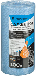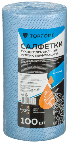 Универсальные высококачественные салфетки TOPFORT из плотного каландрированного нетканого материала 'мельтблаун'. 100% полипропилен. Впитывают воду, а также химические загрязнения и жидкости. Применяются во всех видах промышленной уборки и на любых поверхностях, в том числе для протирки рук. Цвет материала голубой, количество салфеток в рулоне — 100 штук. Удобны в применении за счет нанесения перфорации. <br><br>Внешний вид и/или характеристики товара могут быть изменены производителем в соответствии с производственным процессом.