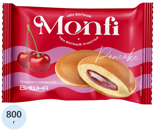 Печенье бисквитное Monfi Панкейк с вишней (20 штук по 40 г)<br><br>Бисквитное печенье «Панкейк с вишней» — это сдобные мягкие пирожные с нежной структурой и ароматной фруктовой начинкой. Каждый панкейк весом 40 г наполнен сочной вишнёвой прослойкой, которая подчёркивает воздушную текстуру бисквита и придаёт изделию яркий вкус.<br><br>Изделие расфасовано в картонную коробку. В упаковке — 20 штук, общий вес составляет 800 г.<br><br>Состав: сахар, мука пшеничная, яйца, агент влагоудерживающий (глицерин), сироп глюкозно-фруктозный, масло растительное, патока крахмальная, пюре яблочное, крахмал пшеничный, разрыхлитель (гидрокарбонат натрия), эмульгаторы (Е472а, Е472b), агент желирующий (пектин), пищевые волокна цитрусовые, сок вишнёвый концентрированный, регуляторы кислотности (лимонная кислота, фосфаты кальция, цитраты натрия), краситель(кармины), ароматизаторы.<br><br>Пищевая ценность 100 г продукта: белки — 5,5 г, жиры — 5 г, углеводы — 68 г. Энергетическая ценность 340 ккал/1420 кДж<br><br>Условия хранения: хранить при температуре 18 (+/-5) °С и относительной влажности воздуха, не более 75% в сухих, чистых хорошо вентилируемых складах, не имеющих посторонних запахов. Срок годности 9 месяцев.<br><br>Страна производства Россия.