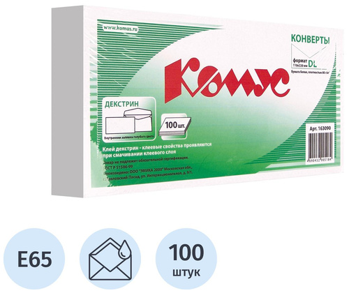 Конверт Комус E65 80 г/кв.м белый декстрин с внутренней запечаткой размером 110×220 мм выполнен из высококачественного офсета 80 г/кв.м, имеет клеевое нанесение типа декстрин (смачиваемый или водорастворимый клей).<br><br>Белизна — 146%, непрозрачность не менее 91%. Предназначены для пересылки 6 листов А4 формата, сложенных втрое, что равно 30 г веса. Упакован в плёнку по 100 штук.<br><br>Срок годности не ограничен. Показатель белизны бумаги — 143-149%.