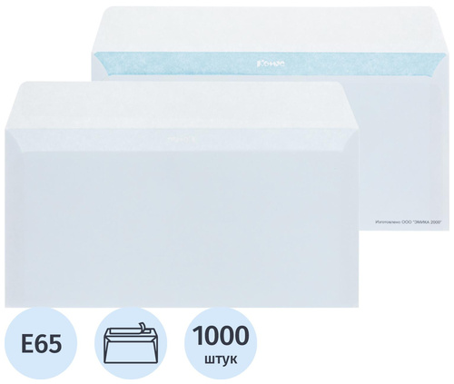 Конверт Комус E65 80 г/кв.м белый стрип с внутренней запечаткой размером 110×220 мм выполнен из высококачественного офсета 80 г/кв.м, имеет клеевое нанесение типа стрип (отрывная силиконовая лента). Ширина клапана 15 мм.<br><br>Предназначены для пересылки 6 листов А4 формата, сложенных втрое, что равно 30 г веса. Упакован в короба по 1000 штук.<br><br>Срок годности не ограничен. Показатель белизны бумаги — 143-149%.