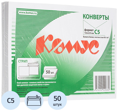 Конверт Комус С5 80 г/кв.м белый стрип с внутренней запечаткой размером 162×229 мм выполнен из высококачественного офсета 80 г/кв.м, имеет клеевое нанесение типа стрип (отрывная силиконовая лента). Предназначены для пересылки 20 листов А4 формата сложенных вдвое, что равно 100 г веса. Упаковка 50 штук. Срок годности не ограничен.