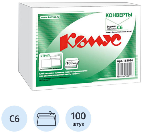 Конверт Комус С6 80 г/кв.м белый стрип с внутренней запечаткой размером 114×162 мм выполнен из высококачественного офсета 80 г/кв.м, имеет клеевое нанесение типа стрип (отрывная силиконовая лента).<br><br>Белизна — 146%, непрозрачность не менее 91%. Предназначен для почтовых отправлений различной документации, писем. Упакован в плёнку по 100 штук.<br><br>Срок годности не ограничен. Показатель белизны бумаги — 143-149%.