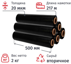 Стрейч-плёнка для ручной упаковки 2 кг 20 мкм x 500 мм x 217 м чёрная вторичное сырьё (6 штук в упаковке)<br><br>Цветная стрейч-плёнка для ручной упаковки представляет собой универсальный упаковочный материал, обладающий функцией маркировки. Используется для маркировки товара, упаковки грузов и обмотки коробок. <br><br>Рулоны плёнки хранят в вертикальном положении в крытых складских помещениях, при температуре от +5 до +30°С.<br>Перед использованием стрейч-плёнку необходимо выдержать при температуре выше +18°С не менее 24 часов.<br><br>Для вторичного сырья длина указана исходя из расчётных параметров веса нетто сырья и может варьироваться в зависимости от партии. Вторичная стрейч-плёнка может обладать запахом полимеров, а так же содержать небольшие вкрапления.<br><br>Возможны незначительные отклонения оттенка стрейч-плёнки из-за клеевого компонента в зависимости от партии и производителя.