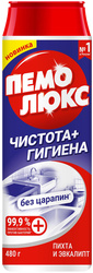 Универсальное чистящее средство Пемолюкс Чистота+Гигиена Пихта и эвкалипт порошок 0,48 кг<br><br><b>Назначение:</b> универсальное средство для уборки дома, сочетающее эффективность и бережный уход за поверхностями. <br>7 преимуществ Пемолюкс:<br>— не оставляет царапин во время уборки;<br>— уничтожает до 99,9% бактерий;<br>— эффективно борется с въевшейся грязью и жиром;<br>— формула на натуральной основе с силой природных компонентов;<br>— подходит для уборки всех бытовых помещений;<br>— не содержит агрессивных химикатов, безопасен для посуды и кожи рук;<br>— дарит дому приятный аромат чистоты и свежести;<br>— поставляется в перерабатываемой упаковке.<br><b>Способ применения:</b> нанесите порошок на влажную поверхность, почистите, затем тщательно смойте водой. Перед первым использованием встряхните упаковку — продукт может слёживаться. Мощная формула с содой и мягким абразивом подходит для чистки керамических, эмалированных, металлических и других твёрдых поверхностей на кухне, в ванной и других помещениях. С осторожностью использовать на полированных и пластиковых поверхностях. Не предназначен для чистки поверхностей, контактирующих с пищевыми продуктами.<br><b>Состав:</b> ≥30% природного молотого мрамора; <5% амфотерных ПАВ, соды, сульфата натрия, красителя, отдушки (в том числе эфирных масел эвкалипта и пихты), антибактериального компонента.<br><b>Меры предосторожности:</b> осторожно! При попадании в глаза вызывает раздражение. После использования тщательно вымойте руки.<br>При попадании в глаза — осторожно промойте водой в течение нескольких минут. При наличии контактных линз снимите их, если это легко сделать, и продолжайте промывание. При необходимости обратитесь к врачу, предоставив этикетку. Беречь от детей!<br><b>Условия хранения:</b> хранить в сухом месте. Температурный режим хранения не ограничен.<br><b>Срок годности:</b> 3 года с даты изготовления (дату изготовления см. на упаковке).<br>