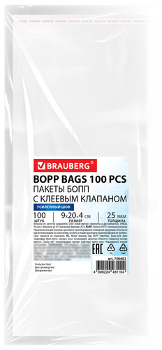 БОПП-упаковка BRAUBERG выполнена из прочного, прозрачного и влагостойкого полипропилена, который подчеркивает эстетику продукта и делает его более привлекательным. Материал надежно защищает содержимое от влаги и пыли, а удобный клеевой клапан обеспечивает быстрое запечатывание. Усиленный шов предотвращает разрывы и повышает долговечность упаковки.
