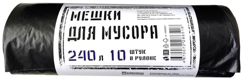 Мешки для мусора Концепция быта Элементари 240 л чёрные (ПВД, 40 мкм). <br> Прочные мешки для сбора и утилизации бытового мусора. Подходят для использования как в жилых помещениях, так и при уличной уборке. Водонепроницаемые, сделаны на 100% из вторичного сырья. Изготовлены из полиэтилена высокого давления (ПВД). Не являются ароматизированными и биоразлагаемыми.<br> Упакованы по 10 пакетов в рулоне.