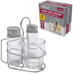Набор для специй WEGLA представляет собой набор из двух солонок-перечниц, предназначенный для удобного хранения и дозированной подачи сыпучих продуктов, таких как соль, перец или иные специи, а также для сервировки стола. В комплект входит устойчивая металлическая подставка, которая гарантирует порядок и компактное размещение набора на поверхности, а также стеклянный стакан для хранения зубочисток. Размер одной солонки составляет 9,4х3,3x3,3 см. Размер стакана для зубочисток – 6,4х5,1x5,1 см.