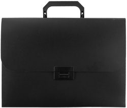 Портфель изготовлен из пластика толщиной 0,6 мм, выполнен в черном цвете с фактурой "песок" и имеет 13 отделений для удобства в систематизации документов формата А4. Складная ручка обеспечивает компактность изделия. Портфель застегивается на клапан. Размер - 330х235х36 мм.