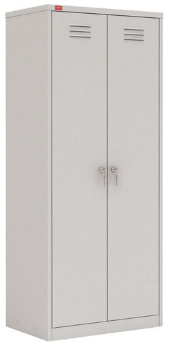 Шкаф хозяйственный, предназначен для хранения хозяйственного инвентаря, документов и одежды. Состоит из двух отделений, каждое из которых запирается на ключ. Одно отделение комплектуется полкой для головного убора, перекладиной и крючками для одежды. Второе отделение комплектуется полками, регулируемыми по высоте. Оснащен ключевыми замками. Тип материала — листовая сталь. Количество полок — 5 штук. Количество замков — 2 (по 2 ключа). Тип покрытия — порошковое. Поставляется в разобранном виде. <br><br>Изображения товаров на сайте не могут гарантировать точную цветопередачу.