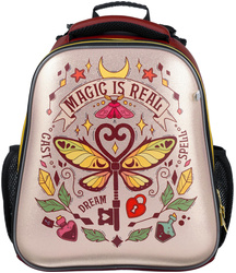 Школьный ранец Комус Класс Basic с принтом Magic is real разработан специально для девочек школьного возраста. Анатомическая спинка обеспечивает правильное распределение нагрузки на спину ребёнка благодаря особой конструкции и мягким подушечкам. Вместительный ранец имеет два основных отделения для удобной организации школьных принадлежностей. Четыре функциональных кармана позволяют разместить необходимые мелочи и канцелярские принадлежности в быстром доступе. Мягкие регулируемые лямки с воздухопроницаемой подкладкой адаптируются под рост ребёнка и обеспечивают комфортное ношение. Усиленное полиэстером дно с защитными ножками предохраняет содержимое от намокания и механических повреждений. Светоотражающие элементы расположены на передней части и лямках, что делает ребёнка заметным в тёмное время суток. Объём школьного рюкзака составляет 16 литров при весе всего 980 граммов, что оптимально для школьника. <br>Габаритные размеры (280×150×360 мм) позволяют вместить все необходимые учебники и тетради. Золотой цвет с оригинальным принтом придаёт ранцу стильный внешний вид. Прочный водоотталкивающий материал экокожи обеспечивает длительный срок службы и защиту содержимого от осадков.