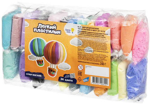 Воздушный пластилин Genio Kids Лёгкий пластилин 24 цвета 240 г (TA1726)<br><br>Лёгкий пластилин от Genio Kids — это увлекательное развивающее занятие, которое вдохновит ребёнка на творчество и поможет создать множество ярких и оригинальных поделок. Благодаря необычной воздушной текстуре пластилин легко лепится, принимает нужную форму и полностью застывает на воздухе в течение суток, при этом оставаясь лёгким, бархатистым и приятным на ощупь.<br><br>В набор входят 24 брусочка пластилина по 10 граммов каждый, упакованные индивидуально. Продукт изготовлен из безопасных компонентов: полимера, антислеживающего агента, загустителя, пластификатора, воды, консерванта и красителя. Он не вызывает аллергии, не крошится, не деформируется, не тонет в воде, а при смешивании разных цветов можно получать новые оттенки. Пластилин не пачкается и не оставляет следов, что делает его удобным для использования дома, в детских садах или школах.<br><br>Набор рекомендован для детей от 3 лет. Упакован в полиэтиленовый пакет с запайкой, размер упаковки составляет 11×25×7 см. Лёгкий пластилин станет отличным помощником в развитии мелкой моторики, воображения и творческих способностей у детей. Продукт произведён в Беларуси, масса набора без упаковки — 240 граммов.