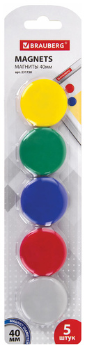 Диаметр магнита составляет 40 мм. 5 штук в комплекте. Разноцветные магниты помогут надежно прикрепить листы бумаги к магнитно-маркерной поверхности досок, витрин и флипчартов. Надежно удерживаются на любой железной или стальной поверхности. Поставляются в удобной блистерной упаковке с европодвесом.