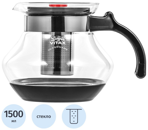 Чайник заварочный с фильтром стеклянный Vitax Walden VX-3305 1500 мл. <br><br>Заварочный чайник Vitax Alnwick VX-3304 подходит для приготовления различных напитков в домашних условиях и на работе. Объем — 1,5 л.<br><br>Корпус выполнен из боросиликатного термостойкого стекла. Контейнер-фильтр изготовлен из нержавеющей стали 18/10. Чайник оснащен пластиковой ручкой, которая не нагревается, и кнопочной системой открывания крышки. <br><br>Преимущества модели: <br>— Съемное защитное дно для удобной переноски. <br>— Подходит для мытья в посудомоечной машине.