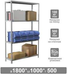 Стойка имеет разборную конструкцию, благодаря чему стеллаж поставляется в компактной упаковке. Максимальная нагрузка на полку, при этом достигает 100 кг, на стеллаж - до 500 кг. Стойки с усиленным угловым профилем сложного сечения 30х30 мм и толщиной металла 1,2 мм. Полки имеют толщину основания 0,5 мм, усилены центральным ребром жесткости. Высота бокового и торцевого ребра полки - 33 мм, толщина - 1 мм. Для повышения жесткости всей конструкции верхняя и нижняя полка усилена дополнительными Г-образными уголками. Шаг установки полок - 25 мм. Опоры пластиковые, нерегулируемые. Вся необходимая фурнитура для сборки в комплекте.
