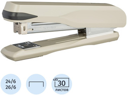 Степлер Комус MSW2430 выполнен в металлическом корпусе серого цвета. Рабочие компоненты изготовлены из высококачественной стали. Степлер совместим со скобами №№ 24/6-26/6, одновременно сшивая до 30 листов бумаги плотностью до 80 г/кв.м. Модель оснащена механизмом быстрой загрузки скоб, вращающейся наковальней и индикатором наполненности лотка для скоб. Прорезиненная основа предотвращает скольжение во время работы и образование царапин на рабочей поверхности стола. Степлер сшивает закрытым, открытым и прямым типом сшивания. Закрытый тип сшивания, при котором ножки скобы загибаются внутрь, даёт возможность надёжно хранить сшитые документы на протяжении длительного времени. Открытый тип сшивания, при котором ножки скобы, загибаются наружу, подходит для временного сшивания документов и даёт возможность быстрого извлекать скобы без повреждения бумаги. Прямой тип сшивания, при котором ножки скобы не загибаются, позволяет прикреплять объявления или документы к мягкой поверхности, например к пробковой доске. Для этого достаточно раскрыть степлер на 180 градусов и закрепить документ. Вместимость лотка для скоб: 50 скоб размером № 24/6 или 100 скоб размером 26/6. Глубина закладки бумаги: 64 мм.<br><br>Для эффективного сшивания максимально допустимого объёма бумаги необходимо расположить степлер на горизонтальной твёрдой поверхности, прикладывая усилия, плавно надавить на рычаг (при необходимости двумя руками), разномерно распределяя усилия по поверхности рычага.