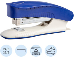 Степлер Комус выполнен в пластиковом корпусе синего цвета. Рабочие компоненты изготовлены из высококачественной стали. Степлер совместим со скобами № 24/6-26/6, одновременно сшивая до 25 листов бумаги плотностью до 80 г/кв.м. Модель оснащена антистеплером, механизмом быстрой загрузки скоб, индикатором наполненности лотка для скоб. Степлер сшивает как закрытым, так и прямым типом сшивания. Закрытый тип сшивания, при котором ножки скобы загибаются внутрь, дает возможность надежно хранить сшитые документы на протяжении длительного времени. Прямой тип сшивания, при котором ножки скобы не загибаются, позволяет прикреплять объявления или документы к мягкой поверхности, например к пробковой доске. Для этого достаточно раскрыть степлер на 180 градусов и закрепить документ. Вместимость лотка для скоб: 50 скоб размером № 24/6 или 100 скоб размером 26/6. Глубина закладки бумаги: 60 мм. Обращаем внимание, что для эффективной работы изделия давление необходимо направлять в зону углубления, расположенной в верхней части степлера над зоной подачи скоб. Степлер при этом эффективно работает как на весу, так и на горизонтальной поверхности. При нажатии на центральную часть степлера скоба сгибаться не будет.<br> Для эффективного сшивания максимально допустимого объема бумаги необходимо расположить степлер на горизонтальной твердой поверхности, прикладывая усилия, плавно надавить на рычаг (при необходимости двумя руками), разномерно распределяя усилия по поверхности рычага.