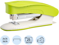 Степлер Комус PSG2425 выполнен в пластиковом корпусе зеленого цвета. Рабочие компоненты изготовлены из высококачественной стали. Степлер совместим со скобами №№ 24/6-26/6, одновременно сшивая до 25 листов бумаги плотностью до 80 г/кв.м. Модель оснащена антистеплером, механизмом быстрой загрузки скоб, индикатором наполненности лотка для скоб. Степлер сшивает как закрытым, так и прямым типом сшивания. Закрытый тип сшивания, при котором ножки скобы загибаются внутрь, дает возможность надежно хранить сшитые документы на протяжении длительного времени. Прямой тип сшивания, при котором ножки скобы не загибаются, позволяет прикреплять объявления или документы к мягкой поверхности, например к пробковой доске. Для этого достаточно раскрыть степлер на 180 градусов и закрепить документ. Вместимость лотка для скоб: 50 скоб размером № 24/6 или 100 скоб размером 26/6. Глубина закладки бумаги: 60 мм. Обращаем внимание, что для эффективной работы изделия давление необходимо направлять в зону углубления, расположенной в верхней части степлера над зоной подачи скоб. Степлер при этом эффективно работает как на весу, так и на горизонтальной поверхности. При нажатии на центральную часть степлера скоба сгибаться не будет.<br> Для эффективного сшивания максимально допустимого объема бумаги необходимо расположить степлер на горизонтальной твердой поверхности, прикладывая усилия, плавно надавить на рычаг (при необходимости двумя руками), разномерно распределяя усилия по поверхности рычага.