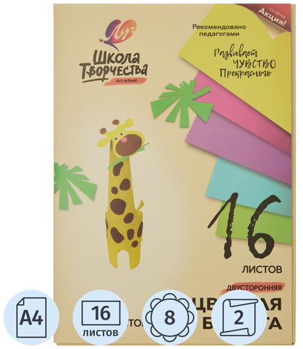 <p>Бумага цветная Луч Школа творчества. 16 листов (8 цветов) цветной двусторонней бумаги из прокрашенной офсетной бумаги плотностью 70г/кв.м. Набор упакован в плотную картонную папку плотностью 200 г/кв.м. Размер A4 формата — 210×297 мм.</p>