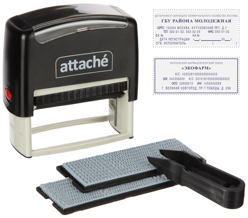 <p>Штамп самонаборный Attache с рамкой предназначен для самостоятельного создания и изменения текста оттиска. Компактный и надежный пластиковый корпус с автоматическим поворотным окрашивающим механизмом. Легкая и чистая замена штемпельной подушки. Оптимальный набор букв, цифр и символов. Размер оттиска — 70×32 мм. Максимальное количество строк: 6. Максимальное количество знаков в каждой строке — 33 основным шрифтом. Максимальное количество знаков: 198. Комплектация: штамп с рифленой пластиной для набора, пинцет.</p>