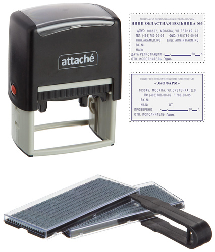 Штамп самонаборный Attache с рамкой предназначен для самостоятельного создания и изменения текста оттиска. Компактный и надежный пластиковый корпус с автоматическим поворотным окрашивающим механизмом. Легкая и чистая замена штемпельной подушки. Оптимальный набор букв, цифр и символов. Размер оттиска — 60×40 мм. Максимальное количество строк: 8. Максимальное количество знаков в каждой строке — 29 основным шрифтом. Максимальное количество знаков: 240. Комплектация: штамп с рифленой пластиной для набора.