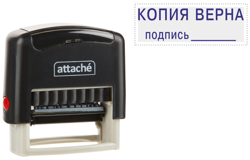 Штамп Attache стандартный для проставления оттиска «КОПИЯ ВЕРНА подпись _____». Компактный и надежный пластиковый корпус с автоматическим поворотным окрашивающим механизмом. Легкая и чистая замена штемпельной подушки. Размер оттиска — 38×14 мм.
