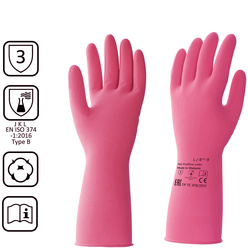 Химически стойкие. Предназначены для защиты от химических воздействий и общих производственных загрязнений. Внутреннее покрытие из хлопка обеспечивает комфорт во время работы. Перчатки защищают руки от загрязнений, воздействия растворов моющих средств на основе щелочей и кислот и прочих раздражителей. Степень защиты от кислот – 80%, степень защиты от щелочей – 40%.