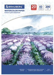 Папка для акварели содержит набор листов, предназначенных для работы с акварелью. Формат А3 (297х420 мм). Обложка - мелованный картон, плотность 235 г/м2. Внутренний блок - акварельная бумага 200 г/м2 по ГОСТу. 20 листов. Белизна 100%.