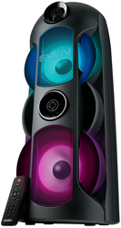Выходная мощность (RMS) – 80 (2х40) Вт. Режим воспроизведения – стерео. Частотный диапазон – 45-22000 Гц. Диапазон частот тюнера – 87.5-108 МГц. Размеры динамиков – ВЧ: 32 мм, НЧ: 145 мм. Беспроводная передача сигнала по Bluetooth. Воспроизведение музыки с носителей памяти формата USB, microSD. Поддерживаемые аудиоформаты: MP3, WAV, WMA, FLAC. Источник питания – литий-ионный aккумулятор: 7.4 В, 4400 мАч (32.56 Втч). USB: DC 5 V. Время работы (при 30% громкости, базовые настройки эквалайзера, в режиме Bluetooth, без подсветки, при комнатной температуре): 18 часов. Время полной зарядки (может меняться в зависимости от используемого зарядного устройства и кабеля): 5 часов. Тип соединения – Bluetooth, проводной (3.5 mm jack). Тип разъёма питания – USB Type-C. Совместимость в режиме TWS – SVEN PS-720. Размеры изделия (ШхВхГ) – 230х640х260 мм. Вес – 5,2 кг.