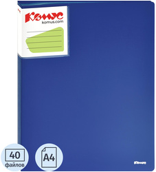 Папка с файлами Комус из коллекции ’Шелк’ выполнена из пластика синего цвета толщиной 0,7 мм. Имеет 40 прозрачных файлов для хранения и демонстрации документов. На корешке предусмотрен прозрачный карман с вкладышем для маркировки, на внутренней стороне створки — дополнительный карман для записок, сим-карт, компакт-дисков. Файловая папка вмещает до 80 листов формата А4.<br /> <br /> <b>В рамках ребрендинга производится перевод дизайна данного артикула с сохранением всех потребительских характеристик товара. На переходный период допускается поставка данной продукции в двух вариантах дизайна.</b>