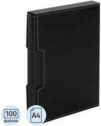 Удобная и практичная файловая папка формата А4 изготовлена из жесткого полипропилена черного цвета толщиной 1 мм. Имеет 100 несъемных прозрачных вкладышей, в каждый из которых можно вложить до двух листов. Подходит для хранения и демонстрации документов на презентациях, совещаниях, создания портфолио. Папка с файлами вложена в пластиковый бокс, который позволяет ставить ее на стол. В боксе предусмотрены выемки для легкого извлечения папки. Оба предмета декорированы окантовкой в виде прострочки. Плотность файлов 35 мкм.