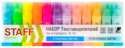 12 цветов в наборе: • 6 пастельных: мятный, лавандовый, пастельный розовый, персиковый, бирюзовый и ванильный, – позволяют создавать мягкие переходы и равномерно подчеркивают необходимую информацию. • 6 неоновых: желтый, зеленый, оранжевый, розовый, фиолетовый и голубой, – помогают ярко выделить важное в тексте. Колпачок и корпус соответствуют цвету чернил.
