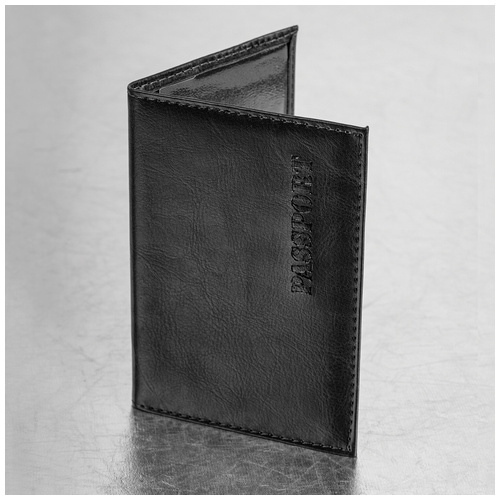 Модель выполнена из экокожи черного цвета и украшена тисненой надписью "Паспорт". Имеет простроченные края и мягкую изолоновую вставку. На внутреннем развороте расположены два кармана из прозрачного пластика. Благодаря компактным размерам 97х138 мм удобно всегда носить с собой.