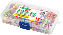 В набор входит 200 пластиковых бусин, 3 метра эластичной нити и компактный пластиковый бокс с ячейками и защелками. Бусины непрозрачные, различных цветов и форм, всего 10 видов: квадратные буквы, разнообразные цветы, черепашки, ракушки, бабочки, карамельки, слоники, котики, звезды. Каждый вид бусин находится в отдельной ячейке. Диаметр эластичной нити – 0,5 мм.