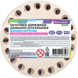 Донышко для вязания представляет собой гладкое и шлифованное с обеих сторон деревянное основание диаметром 10 см и толщиной 3 мм, с 20 отверстиями по периметру, предназначенное для вязания крючком. Диаметр отверстий – 8 мм. В комплекте 10 штук.